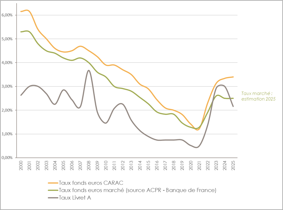 Le fonds en euros de la CARAC affiche une performance solide, régulière et durablement supérieure au marché, avec en moyenne sur les 25 dernières années un rendement deux fois supérieur à celui du Livret A et d’environ 30 % supérieur au taux du marché.