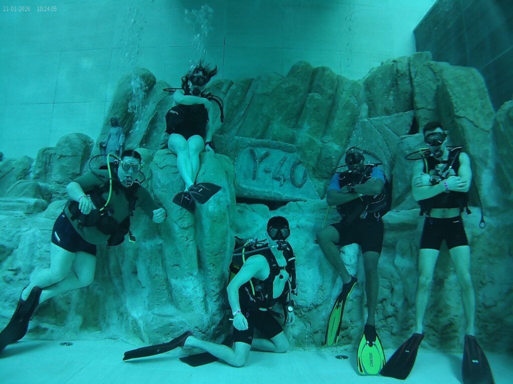 Le site Y40, avec sa fosse de 40 mètres, a permis de réaliser des exercices variés, comme des remontées assistées, le travail sur la stabilisation, et même l’exploration de grottes étroites et sombre, offrant ainsi une expérience de plongée complète et captivante.