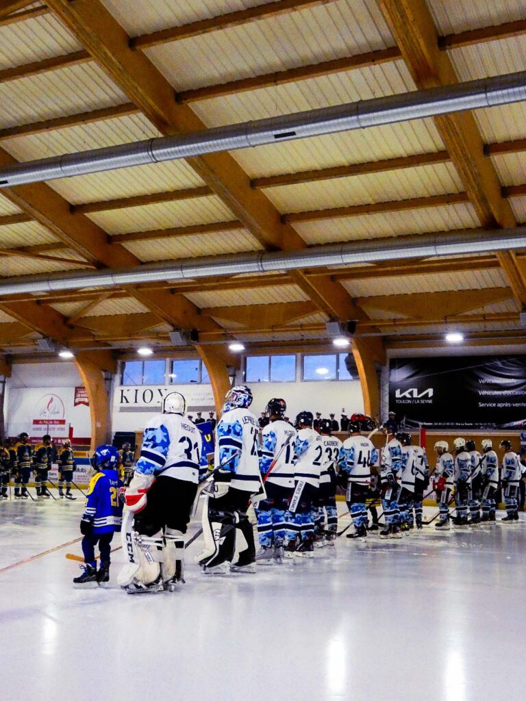 17h30, les joueurs entrent sur la glace pour l’échauffement pendant qu’environ 700 personnes pénètrent l’enceinte de la patinoire. Dans les tribunes se côtoient des marins, à domicile sur leur terre toulonnaise, mais aussi des terriens, venus en tenue depuis le 519E Régiment du Train ou le 54E Régiment d’Artillerie, et beaucoup d’autres, venus encourager leurs équipes.