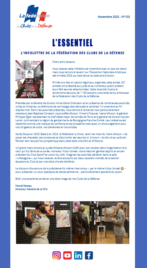Vous recevez cette infolettre de novembre avec un peu de retard mais nous tenions à revenir sur l’Exposition Nationale Artistique des Armées 2025 qui s’est tenue ce week-end à Autun.